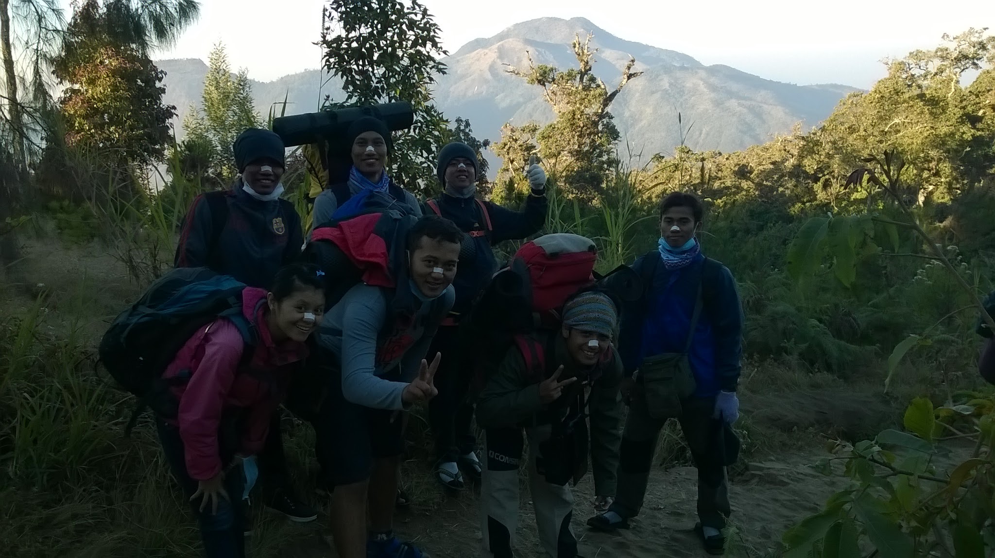 Kenalan dulu gaes, mulai dari kanan bawah ya, Arif, Cak A'an, Rendy, Wulan. Mulai dari kanan atas, Imam, Agung, Cah Haris. Foto ini diambil saat perjalanan dari Basecamp ke Pos 1.